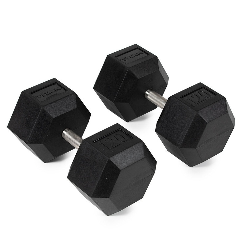 Unleash your inner Titan with the Rubber Coated Hex Dumbbells with stainless steel straight handles. These sturdy weights are premium quality equipment ideal for home and garage gyms. The straight, easy-to-grip handles are crafted from stainless steel and have a knurled texture for a comfortable and firm grip. They are offered in pairs ranging from 5 LB to 120 LB, featuring a 5″ straight handle with a 28mm to 32mm diameter. The cast iron hexagonal heads encased in durable black rubber feature embossed weight increments and the TITAN logo on two sides for easy identification. These branded dumbbells are a great addition to any gym, whether you are just starting or a seasoned lifter.