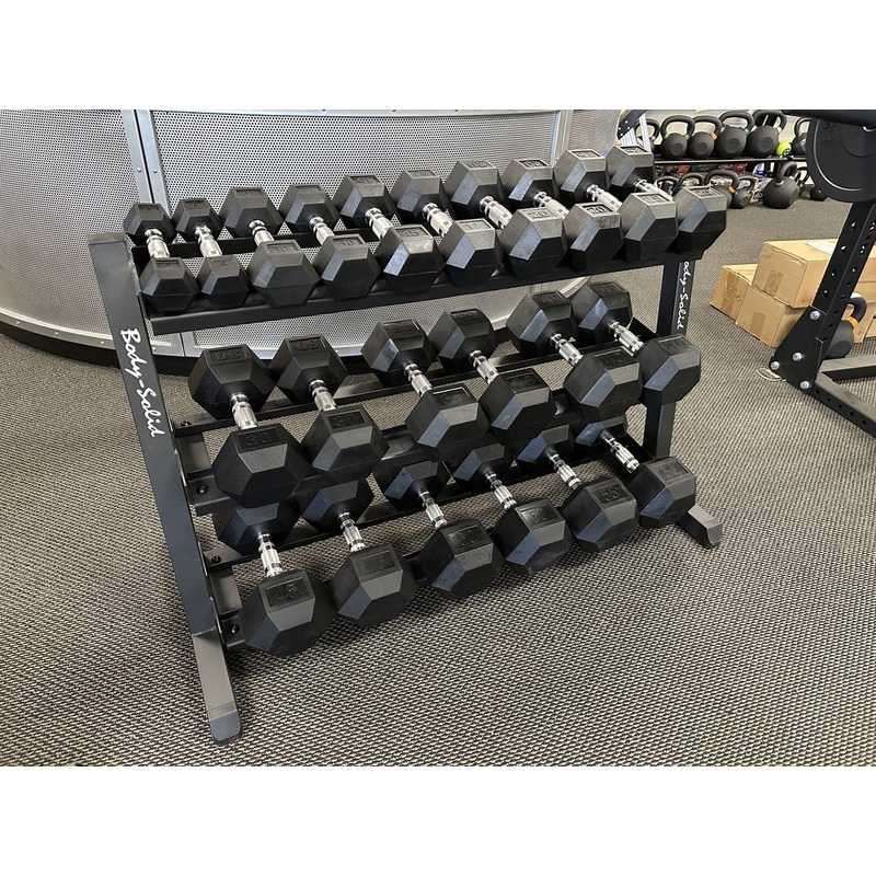 5-55LB IN 5LB INCREMENTSRACK IS 48" WIDE BY 23" DEEP (SPECIAL SIZE RACK THAT ALLOWS THE EXTRA PAIR)SET IS SOLD BRAND NEW IN THE BOX FOR ONLY $1049!
