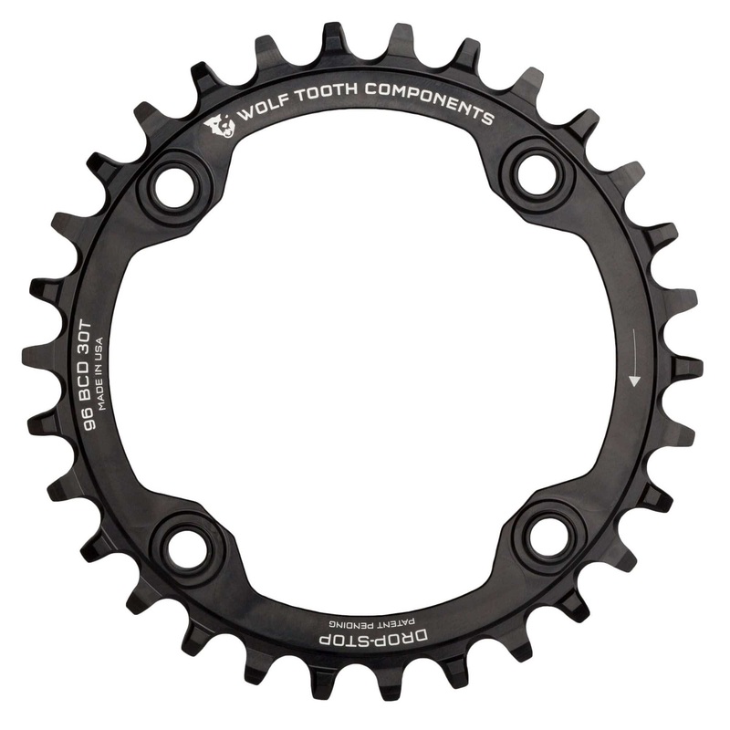 Drop-Stop technology. On Wolf Tooths patented wide/narrow chainring, the wide side of the tooth has maximum contact on the drive side which spreads the load and improves chainring life. The narrow side allows clearance for mud and debris which reduces friction.