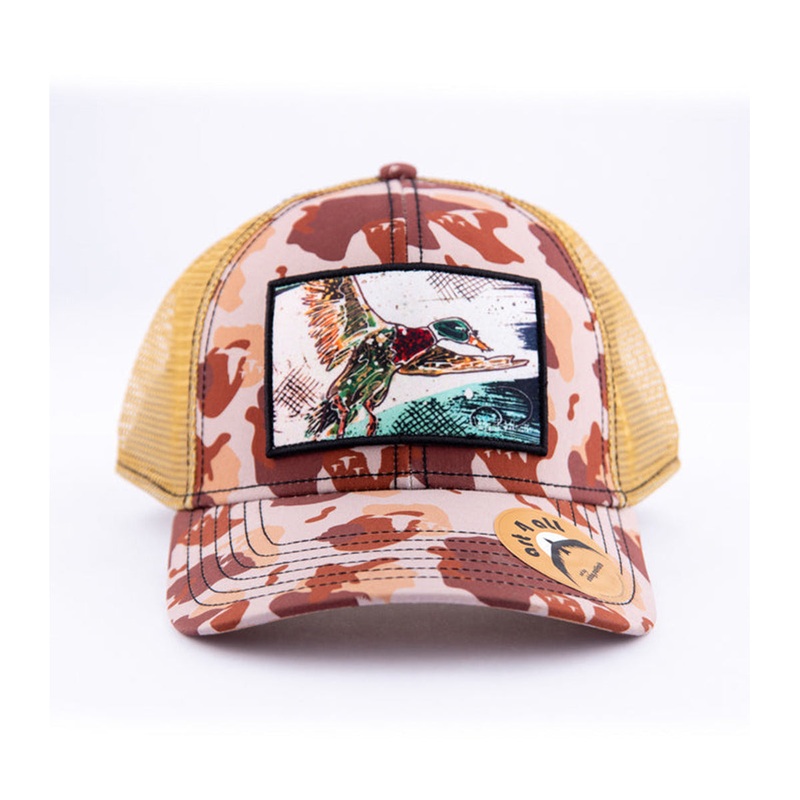 Description:Low Profile TruckerSetting up decoysin the marsh at first light. This is a foam trucker hat with a patchwe designed this camouflage with ducks flying through it.