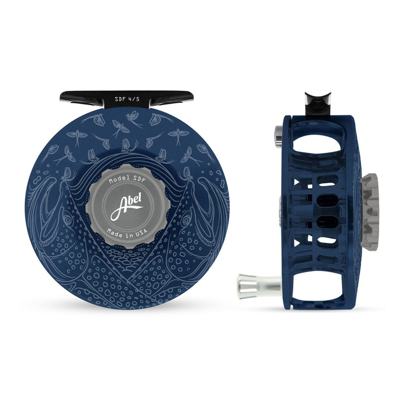 Abel SDF Solid Reel 4/5 Satin Deep Blue, Satin Platinum Drag Knob, Underwood Mayfly Flurry with Platinum Handle