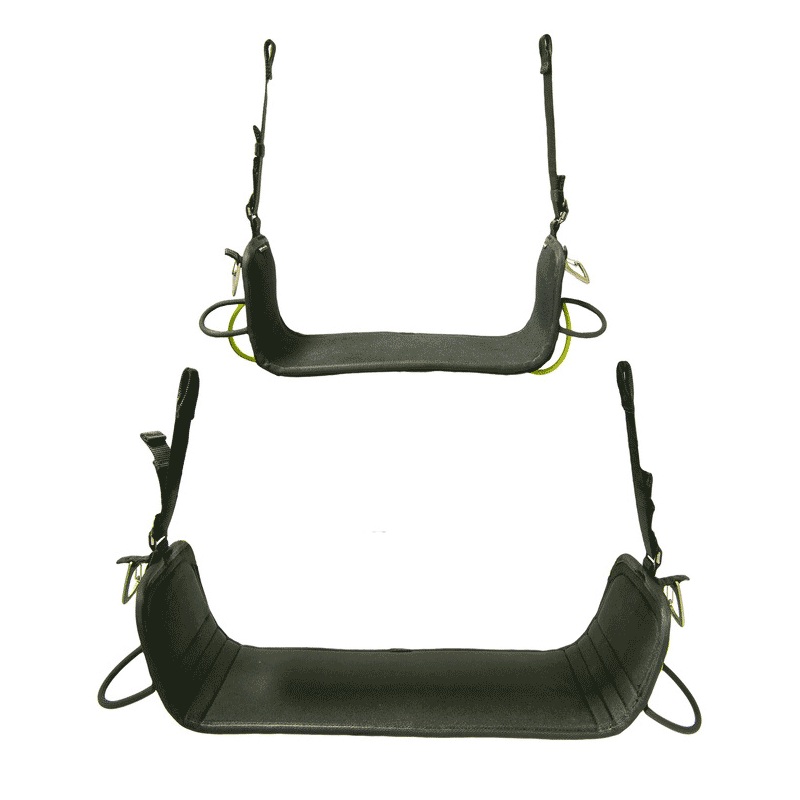 - Two integrated carabiners for attaching the seat to the harness to prevent interference during transportation