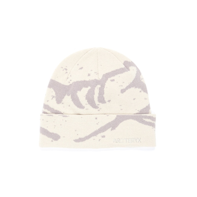 A folded beanie from Arcteryx featuring an all-over Archaeopteryx motif and an embroidered text logo to the front. Made from 100% recycled polyester. One size fits most.