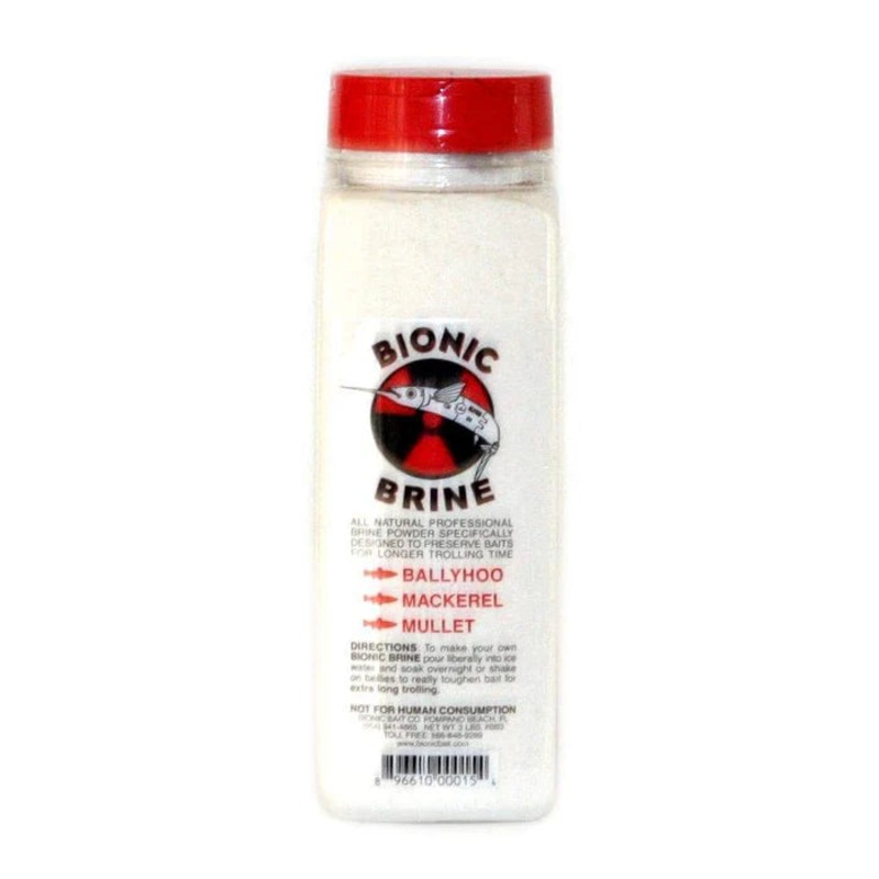 Bionic 3lb Bottles Brine SaltsBionic Brine is a proven tool for toughening up dead bait such as ballyhooMix this powder with ice water, and it toughens your baits upYou can also sprinkle it on baits for a similar effectBionic Brine is made with all natural