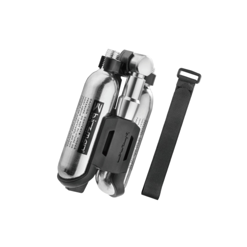 A CO2 inflator set that attaches onto down/seat tubes in place of a bottle cage or to the Uncage Side Draw Bottle Cage.Includes a Velcro strap to carry additional inner tubes and tire levers.The set includes 1 x E-Grip valve head, 2 x 16g CO2 cartridges, 1