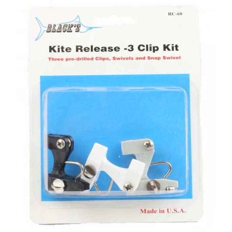 The RC60 Black Marine's Kite Release Clip Kit has 3 clips. Kite release set.Instructions: To rig the kite line: 40' from kite end of the line, cut the line and tie in the smallest swivel. Then 40' from the smallet swivel cut and tie in the medium swivel. R