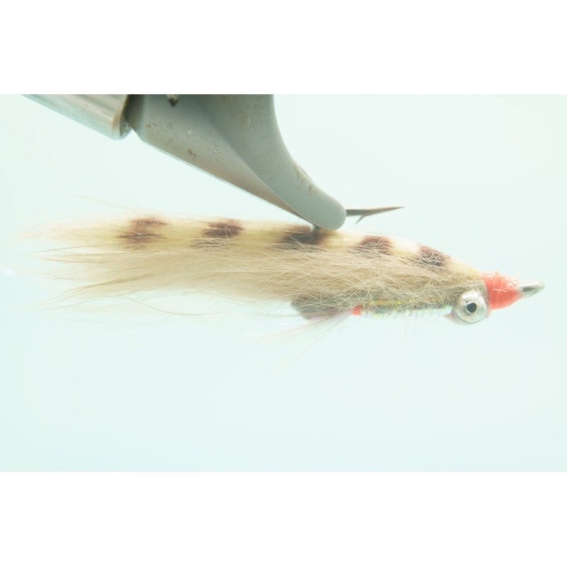 Henry Cowen’s Bonefish Scampi was developed in the mid 1990s in the Bahamas for picky and finicky bonefish. Widely fished across the flats of Belize, Mexico, Los Roques, and even the Seychelles. This version is tied with a barred bunny fur wing and bead chain eyes to make it suspend in the water column.