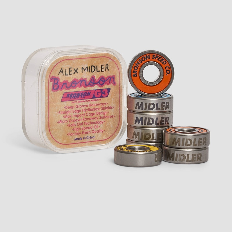 Pack of 8 Bearings Pro Model: Alex Midler Deep Groove Raceways Removable Frictionless Shields Micro Groove Raceway Surfaces Max Impact Cage Design Balls out Technology High Speed Oil Bronson Speed Co is proud to release Alex Midler's signature G3 bearing f