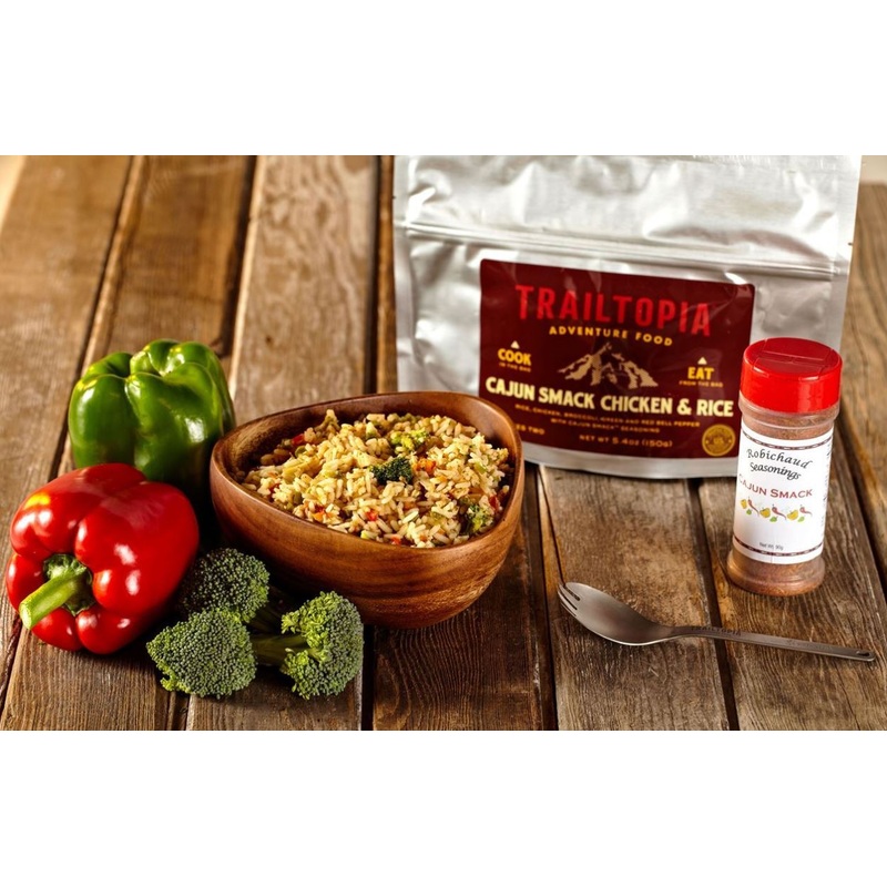 Ingredients: PARBOILED LONG GRAIN RICE (RICE, NIACIN, IRON, THIAMIN, FOLIC ACID), FREEZE DRIED COOKED CHICKEN, HULLED HEMP SEED, CAJUN SMACK SEASONING (BROWN SUGAR, SALT, SPICES, PAPRIKA, GARLIC, ONION), YEAST EXTRACT, ONION, FREEZE DRIED BROCCOLI, DRIED GREEN BELL PEPPER, DRIED RED BELL PEPPER