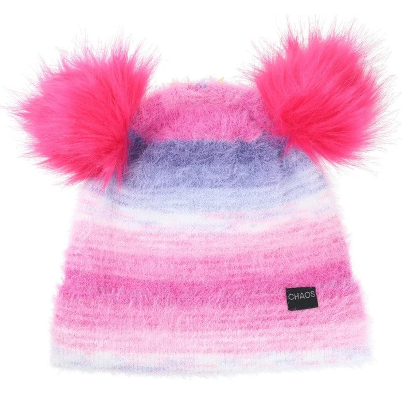_____________ Kids space dyed cuffed beanie with double faux fur pom 100% nylon Style: 224052 Origin: PRC Designed in Canada _____________