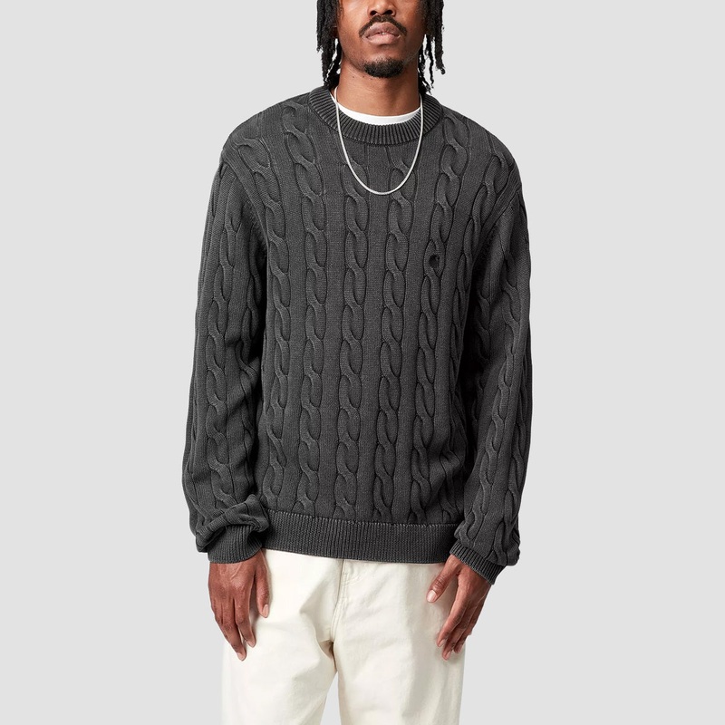The Carter Sweater is a midweight, cable-knit style made from cotton yarn. An embroidered ‘C’ Logo appears on the chest.