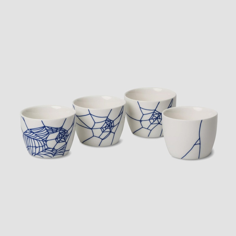The Theory and Practice Soba Cup Set is composed of four porcelain cups, each featuring a graphic print. A Script Logo appears at the base.