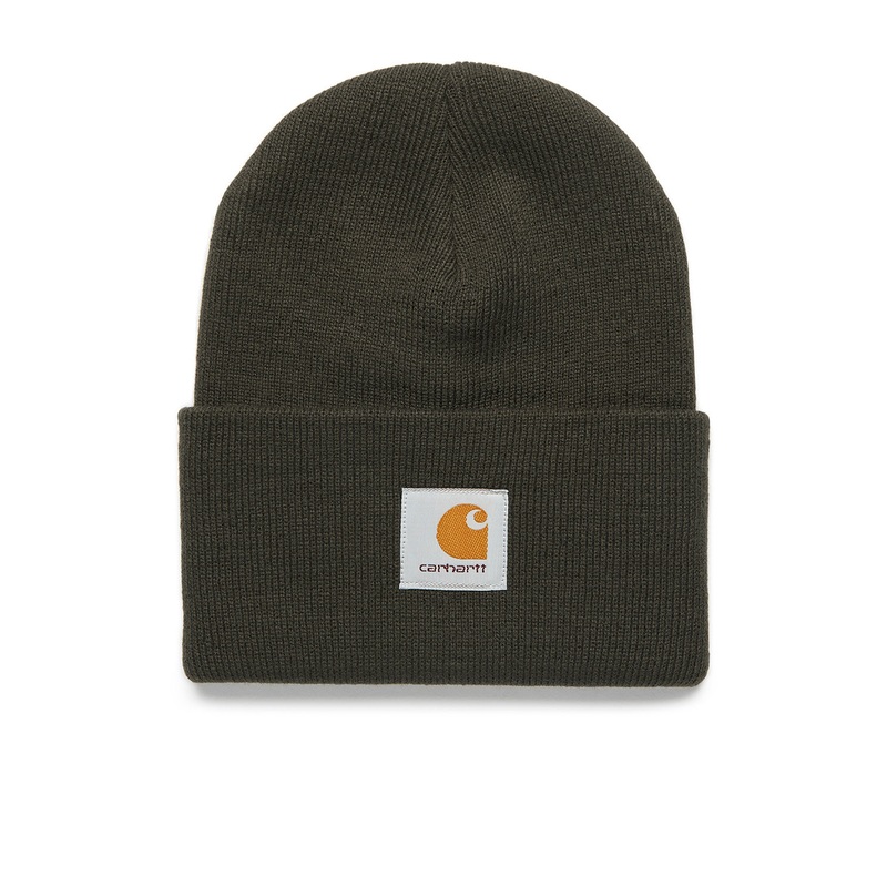 Carhartts famed watch hat, a classic that needs little introduction. Stretchy and soft acrylic in a rib-knit with a woven square patch logo. The hat stands at 23.5cm tall.
