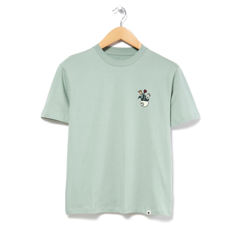 A simple, clean style produced in a soft organic cotton, it has an inverted Carhartt logo; the planter, with flowers sprouting from it as a small chest print. Feminine, neat fit.