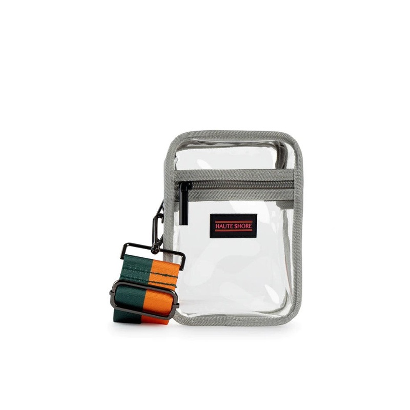 The perfect on the go companion. The Casey crossbody offers compact construction that accommodates a phone, lipstick and has credit card slots. ________ Clear vinyl Green and orange stripe strap Vinyl Body Adjustable crossbody strap L 4.75x D 1.5 X H7 inch