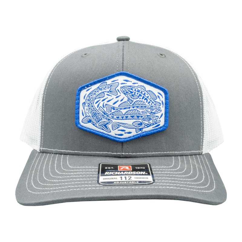 Exclusive "Bait Ball" Woven PatchArtwork features Pike, Smallmouth and Walleye swarming baitfishRichardson 112 ModelSnapbackColors: Grey / White