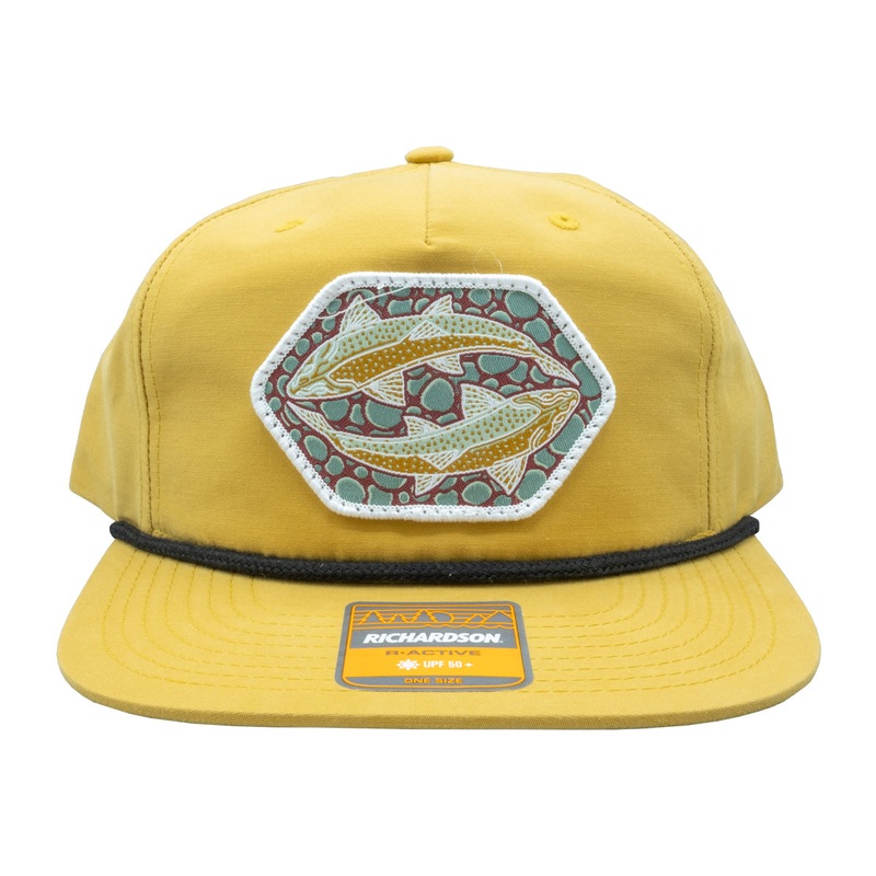 Exclusive "Gin Clear" Woven PatchArtwork featurestwo trout in a crystal clear river.Richardson 256 ModelSnapbackColors: Mustard / Black Rope