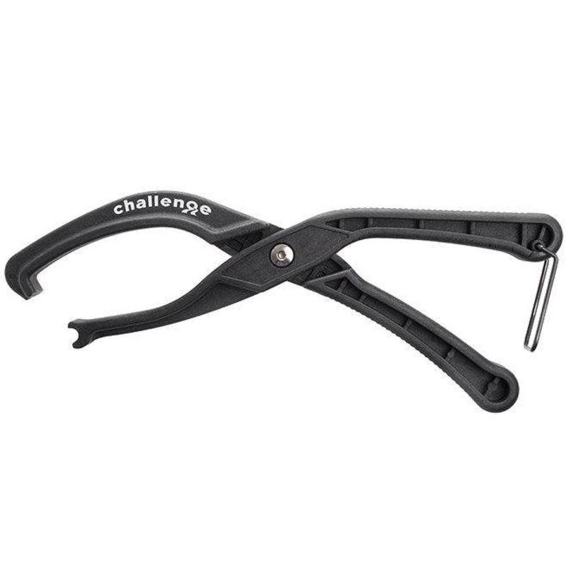 Put an end to snapped tire levers and sore thumbs. Installing tires can sometimes be a struggle, even after pushing the tire beads into the center of the rim and working the bead with a tire lever, some rim/tire combinations just wont budge. The Challenge clincher mounting tool makes light work of tight tire beads; simply position the slotted jaw onto the opposing rim and place the hook under the stubborn bead, then roll the bead over the rim into place.