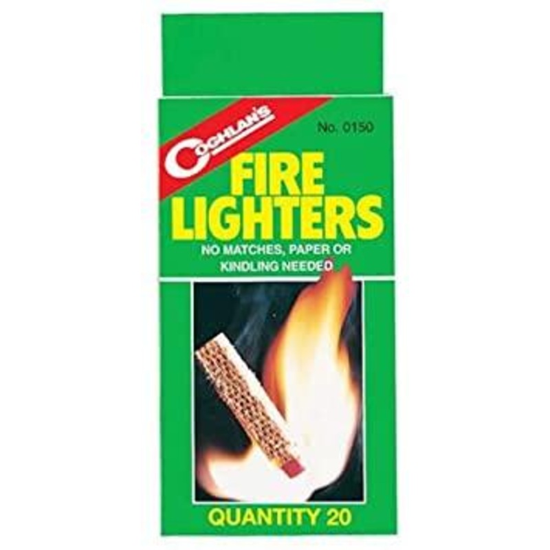 No matches, paper, or kindling requiredCoghlan's 20-Pack Fire LightersNo matches, paper, or kindling requiredStrikes on box onlyItem Weight31.8 gProduct Dimensions2.5 x 12.7 x 5.1 cmItem model number0150Length13 millimetersWeight90.7 gramsNumber of Items1I