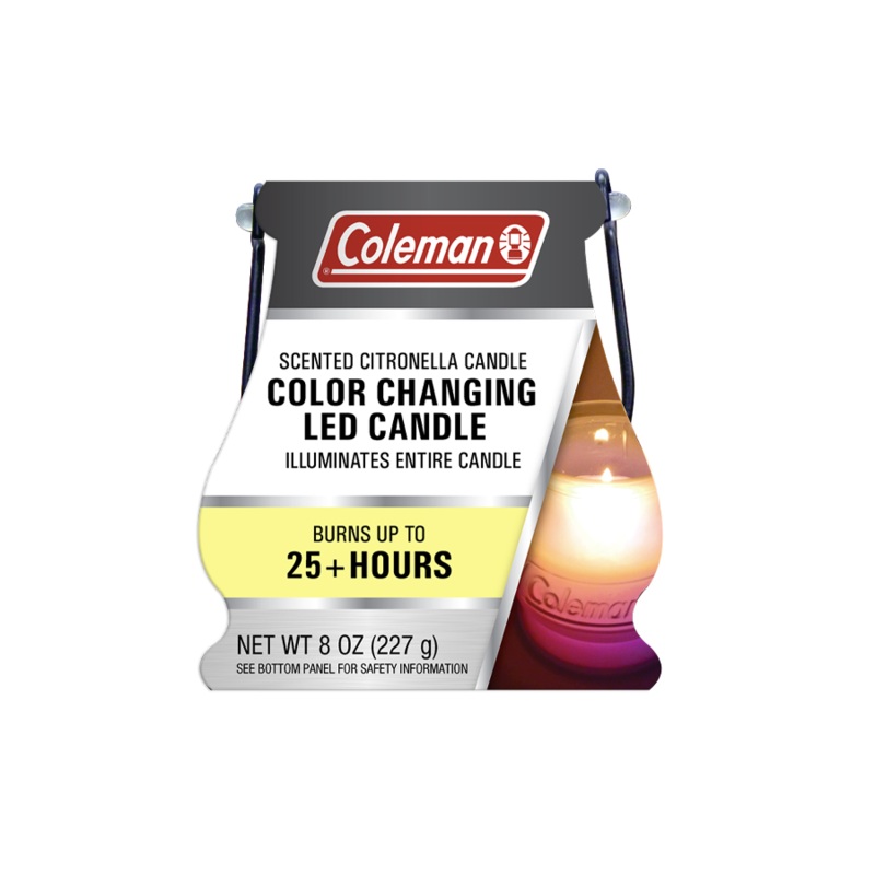 Unique citronella scented candle illuminates the entire wax candle with a color-changing LED when lit Burns up to 25 hours Color changing LED candle, comes in an embossed glass candleholder Perfect for backyards, campsites, picnic areas, and patios
