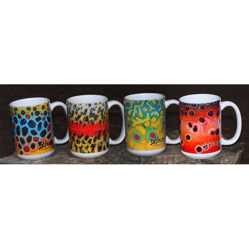 15 ounce porcelin coffee mugs with Derek Deyoung's art work available in Brown, Rainbow and Brook trout skins. They make a great gift for fly fishermen.