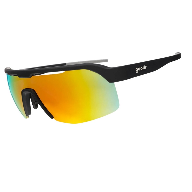 These black shield Do It For The Victory Dance sunglasses with half-rim frames and burnt orange reflective lenses won't slip or bounce when you spike the ball and promptly follow that up with a legendary victory dance in the endzone that can only be descri