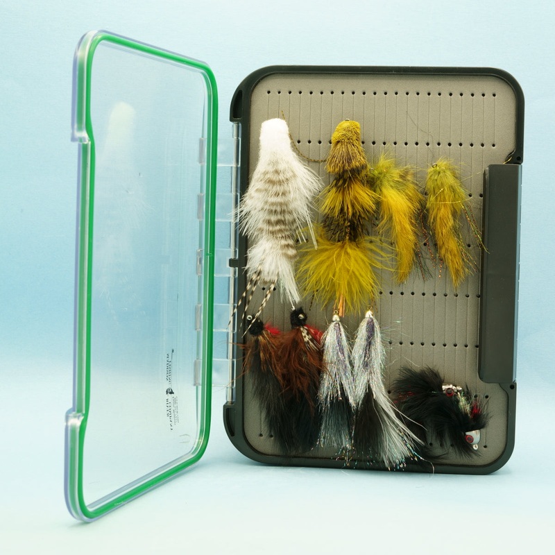 Danny's streamer vault for targeting big Montana Trout.MRFC Logo MagnumFly Box loaded with 1 White Silk Kitty, 1 Olive Dungeon, 2 Olive Mini Loop Sclupins, 2 Mint Sparkle Minnows, 2 Smoke Sparkle Minnows, 2 Black Sculpzillas, 2 Copper Zonkers, 2 Pearl Zonk