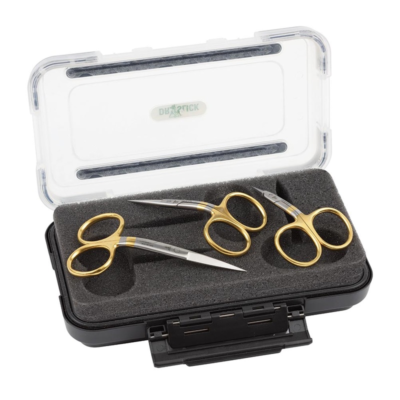 Dr. Slick Bent Scissors in Large Fly Box, Picking flat scissors up from a flat surface is no fun, and sliding them across your bench to get them in your hand is a time killer. By placing a bend in the middle of the scissor, the problem of picking up is solved. Handles and performs just like a regular straight scissor. Excellent with natural materials and can handle most synthetics. Set of three bent-shaft scissorsincludes theArrow, All Purpose, and Hair models.