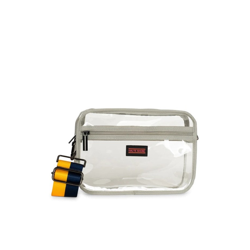 Camera style crossbody with top zipper entry and front hidden zipper compartment.Perfect for concerts, sporting events and festivals. ________ Vinyl body Includes an adjustable 1.5"navy & yellow stripe strap. Dimensions 9.25"L x 2"w x 6"H ________