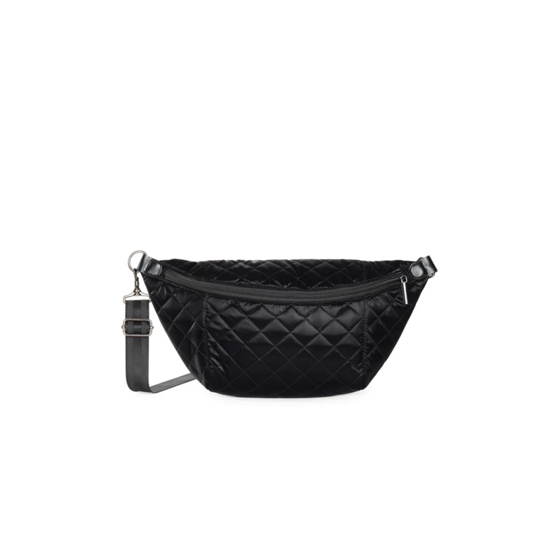 - Quilted puffer sling bag featuring top entry and additional back zip pocket.Slingstrap adjustable to 40 inches.