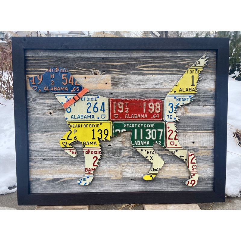 With Frame Add-on– While my pieces look amazing hung without a frame, I feel that mounting the artwork on Barnwood really adds definition and depth, and perfectly compliments aged license plates. Should you choose to have your piece framed, please specify whether you would like Espresso-stained or natural Barnwood as the background in the Special Notes and Requests textbox prior to adding it to your cart.