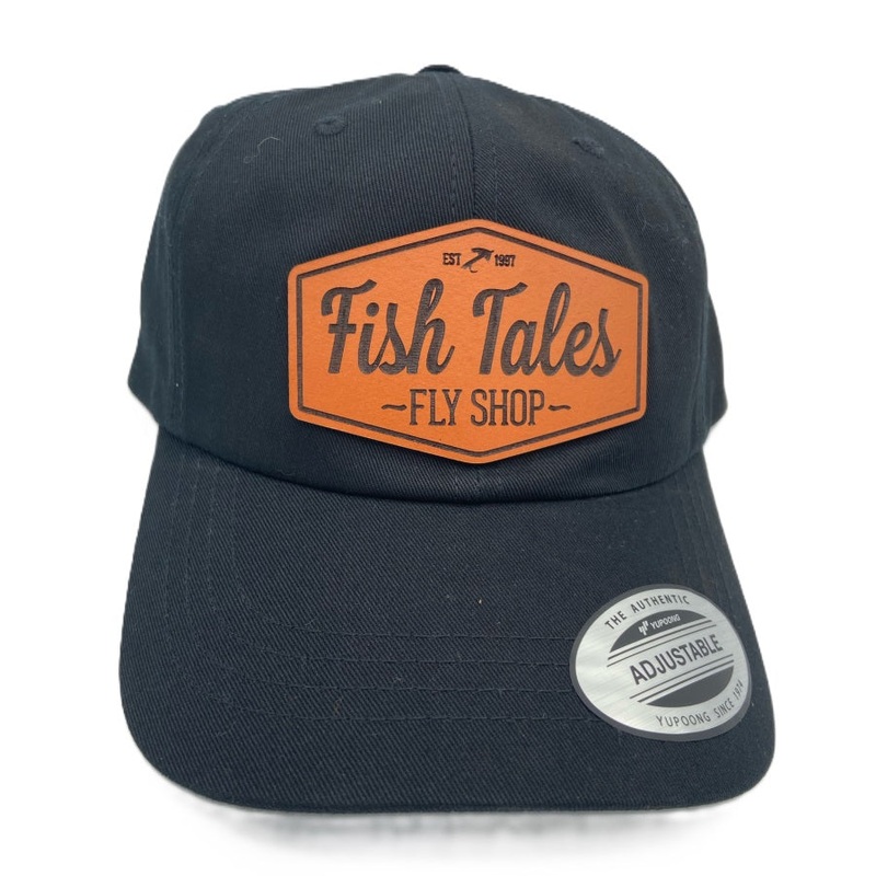 The Fish Tales Dad Cap with Leather Patch features classic cotton twill styling in a full cloth ball cap. A stylish Fish Tales logo leather patch adorns the front of this unstructured 6-panel low profile hat.