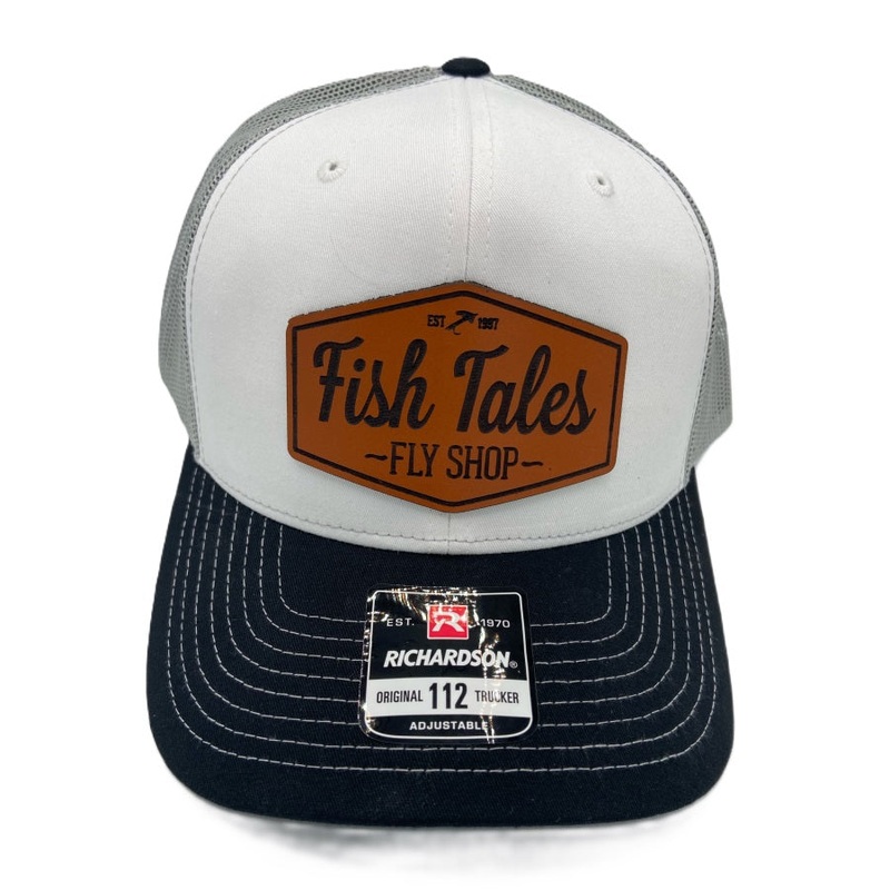 The Fish Tales Leather Patch Trucker Hat features a leather Fish Tales logo patch on the front of five color combos of Richardson mesh back trucker hats.