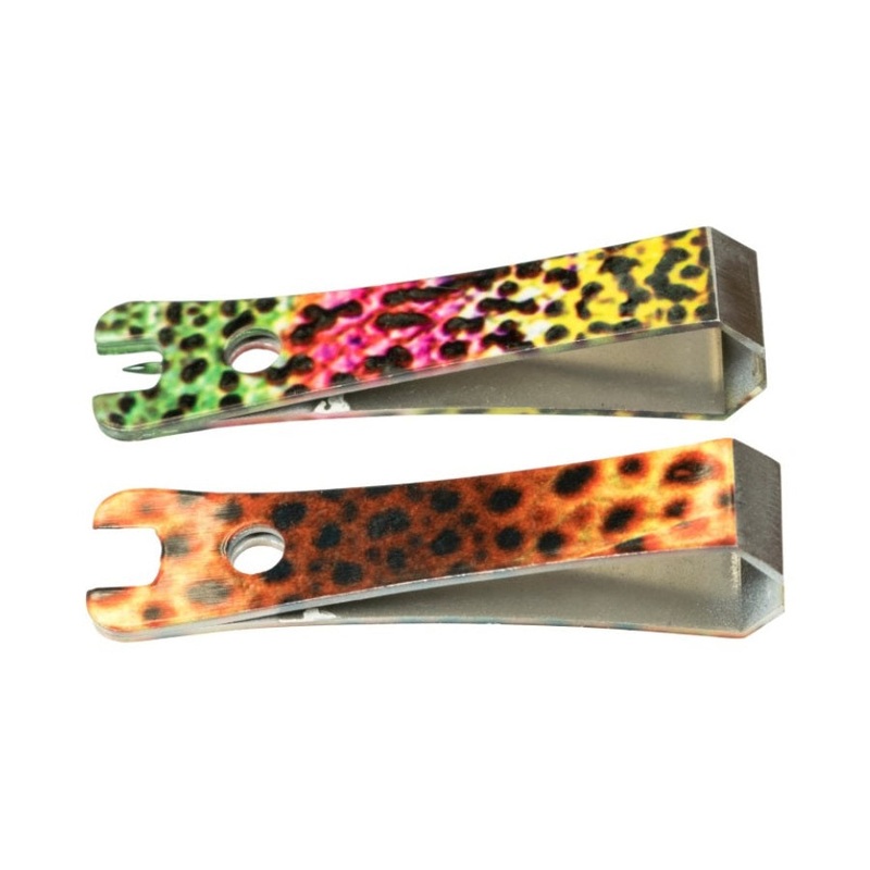 Get back to basics with a simple set of nippers with a trout print finish. These 2" line nippers with eye cleaning pin get the job done for trout sized tippet and leaders/Brown trout or rainbow trout print2" longBuilt in eye cleaning pin
