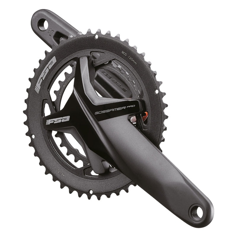 Full Speed Ahead Gossamer Pro BB386EVO Crankset – 172.5mm 11/12-Speed 50/34t 120/90 BCD 386 EVO Spindle Interface Black. The FSA Gossamer Pro 386EVO is a high-end crankset for alloy lovers. The cold-forged aluminum arms are heavily scalloped for the maximum strength to weight ratio and the versatile 30mm BB368EVO spindle is forged from an AL7050 material. The Gossamer fits many combinations of bikes riders and riding styles.
