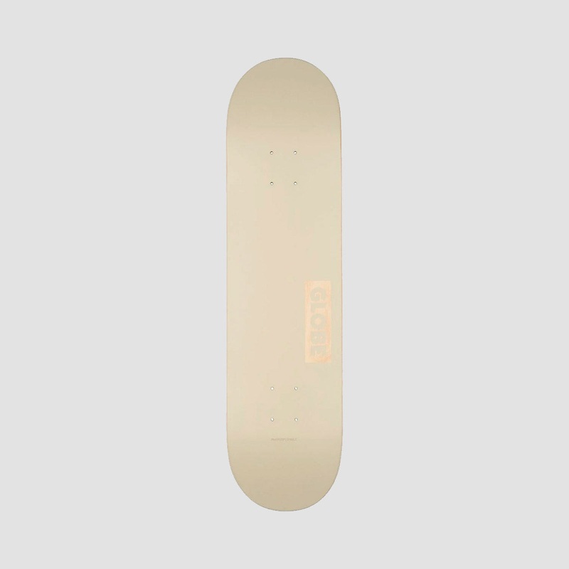8.0" x 31.63" x 14"WB. The Goodstock in colour Off/White is a GLOBE Resin-7 deck. It is made of Resin-7 hard rock maple. It has a full concave and matte finish, logo knocks out to wood.
