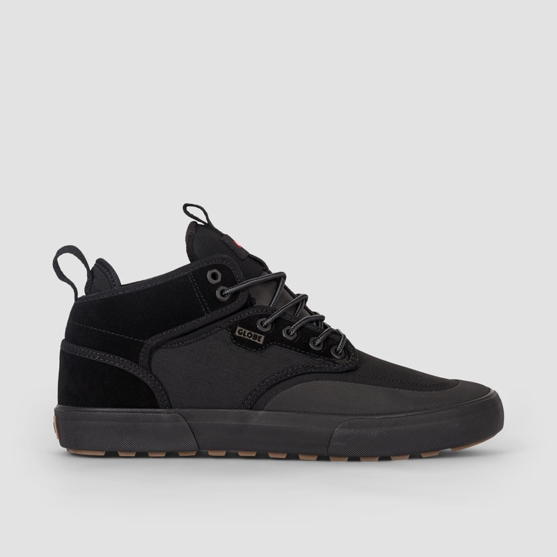 The Motley Mid in Black/Black Summit is a vulcanized mid-cut shoe featuring a seamless toe, padded mid-cut collar for ankle protection, and reinforced toe and heel for durability. Constructed from a durable action leather and mesh combination with Globes Shockbed insole for lasting impact control.
