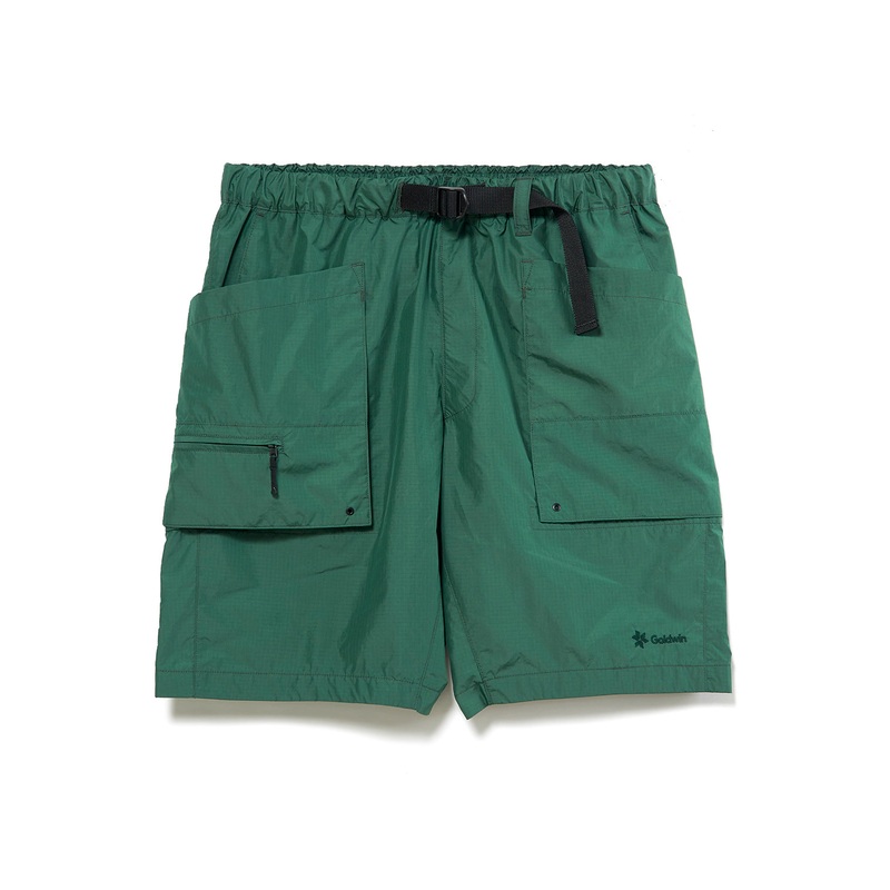 The Rip-stop Cargo Shorts are a lightweight technical short, which sit above the knee. Produced in a durable but featherlight polyester ripstop. Distinctive large wrap-around cargo pockets with slotted hip pockets set within, and an additional zip pocket to the right leg. Elasticated waist with a built-in webbing belt and an embroidered Goldwin logo round them out.