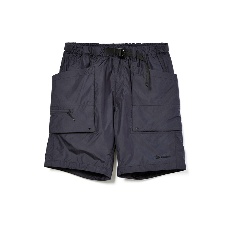 The Rip-stop Cargo Shorts are a lightweight technical short, which sit above the knee. Produced in a durable but featherlight polyester ripstop. Distinctive large wrap-around cargo pockets with slotted hip pockets set within, and an additional zip pocket to the right leg. Elasticated waist with a built-in webbing belt and an embroidered Goldwin logo round them out.