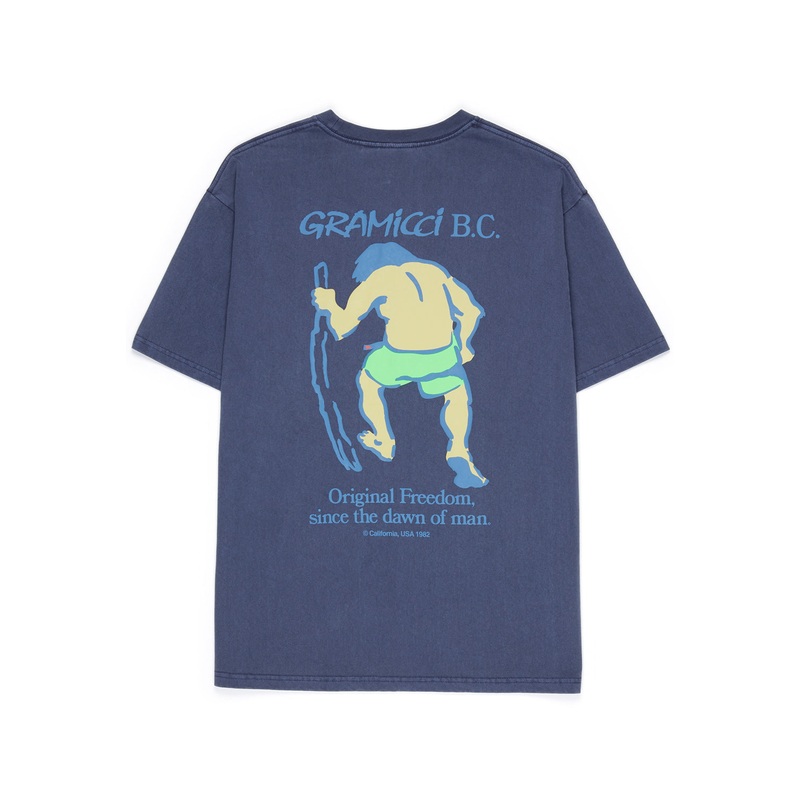 Produced in a high-quality cotton jersey, with a dry handle and washed to give a worn-in feel. Small chest graphic and large back print depicting early man.Gramiccis sizing can be confusing. The size label states the Asia and US size, but like most UK base