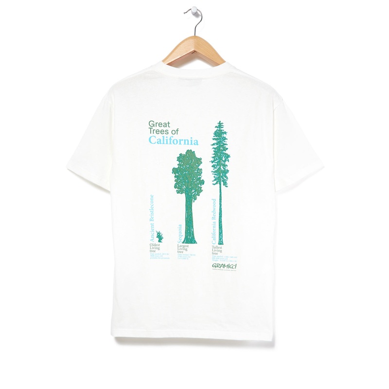 Produced in a high-quality organic cotton, with a dry handle and washed to give a worn-in feel. The Cali Trees Tee represents three titans of the tree world native to California, the Ancient Bristlecone, Sequoia and Redwood are represented in scale on a la