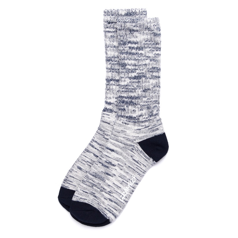 Perennial performers, the Soft Rib Crew Socks from Gramicci. A cotton rich ribbed style with a blended yarn of mixed colours and solid contrast heel and toe.