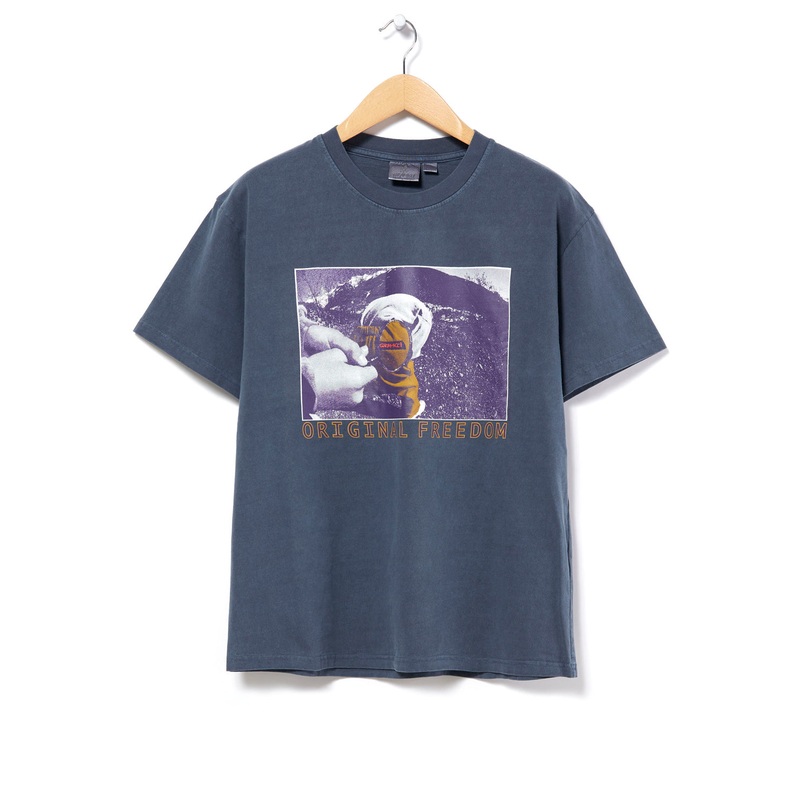 Produced in a high-quality organic cotton jersey, with a dry handle and washed to give a worn-in feel. Small Gramicci logo at the chest and large back graphic celebrating the Original Freedom tagline.