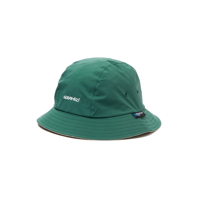 Utilising Pertex Shield, Gramicci have produced this lightweight, waterproof, and breathable bucket hat. It has a stash mesh pocket to one side, with eyelets for additional breathability. Completed with an adjustable drawcord, Gramicci embroidery and a structure contrast brim.