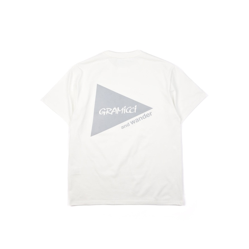 The Backprint Tee, has a chest pocket with muted branding and contrast bar-tack stitching. The back has has the large And Wander pennant with the Gramicci callout.