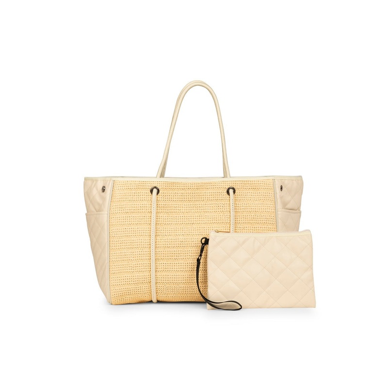 Vanilla quilted vegan leather sides with raffia center.This neoprene tote is the perfect blend of style and functionality.Ultra light weightSide panels expand for a phantom shape or snap in for a streamline lookRemovable hard bottom linerRemovable wristlet