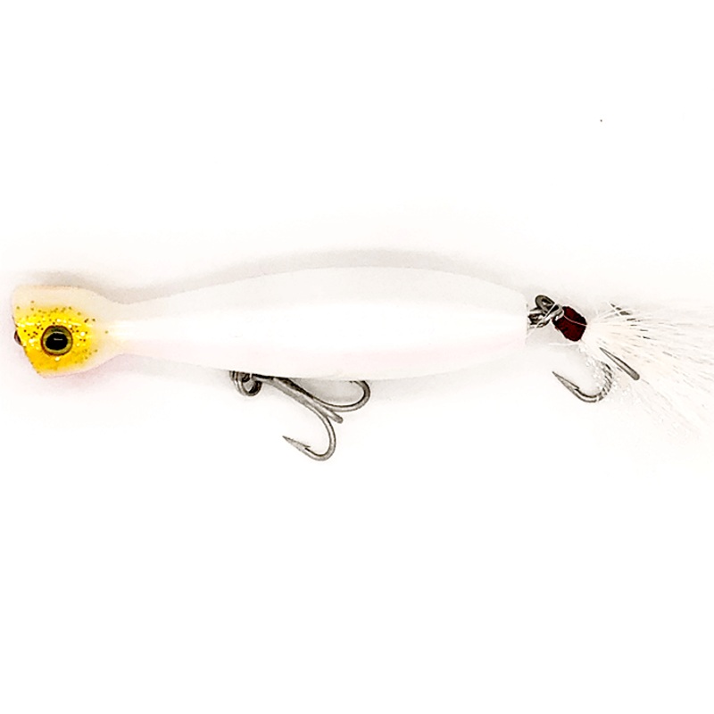 A New Floating Version of a bottle neck popper from long ago. Cast bring lure to top, then use a pop-pause retrieve to mimic a wounded bait-fish. Big splash, little lure! A favorite saltwater Popper for striped bass, bluefish, tuna, and redfish plus many m