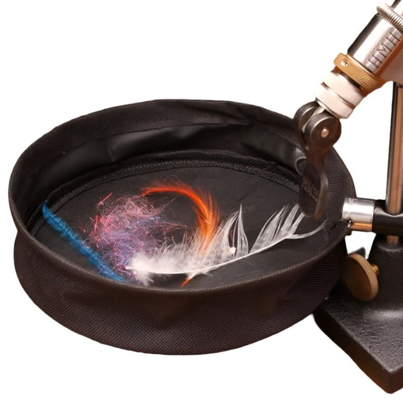 Hareline Low Profile Trash Holder fits on the stem of most vises. This low profile basket attaches to your vise post and helps you keep your tying area tidy.Compatible with most visesHelps keep your tying desk tidy
