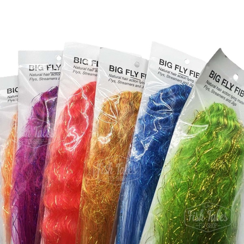 Hedron Curled Big Fly Fiber Flash Blends are both straight and curled fibers in one length, for large body flies with long tails in an extremely light, easy-to-cast fiber. Flash blends contain multiple colors and/or flash.