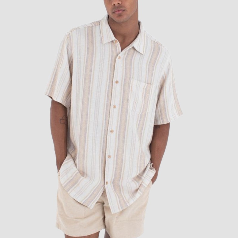 The Oceanside men's short sleeve shirt combines a fresh and relaxed style with a natural and comfortable tailoring. Made from a lightweight linen and rayon blend with wooden buttons that reinforce its authentic look, it features a stylish striped print for
